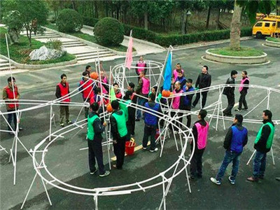 超大型团队创意体验项目之——超级过山车。在精心设计的项目中,结合过山车的主题,用一道道项目来挑战每一位学员的决心和恒心。从体力,智力,承受力各方面给学员施加压力,你将与你的团队成员一起来设计和建造这个世界上最令人兴奋和最具创意的过山车。全队所有队员利用现有的道具搭建一个长于6米高不小于1.5米的过山车,且篮球要在做好的过山车上,从起点最高点运行到最低处,且在中途球不可以跃出跑道。每组完成一小段,只可以用官方提供的道具。